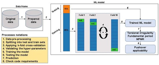 The ML model aims to predict three output parameters (the period, torsional irregularity, and MPMR) based on the input features. After completing the analyses, a dataset consisting of 9723 cases was established. Each case included the 12 labeled input parameters with their corresponding output parameters. Table 1 provides a statistical description and variation for the 12 features in the dataset. The last column in the table displays the total number of different values for each feature. By incorporating a carefully curated and diverse set of unique values across all features, the dataset was constructed to have an organized variety. The statistical measures presented in Table 1 convey the range and extent of diversity embraced within the dataset for each feature. For example, the highest value of 36 for the variable H indicates that the model has been trained using instances wherein the total height of the building reaches a magnitude of 36 m.