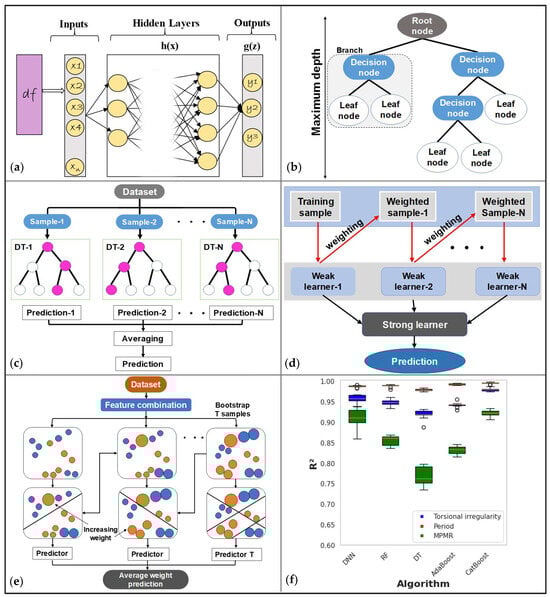 The general architecture of the ML models: (a) DNN; (b) DT; (c) RF; (d) AdaBoost; (e) CatBoost, and (f) R2 results of each ML algorithm for the validation set.
