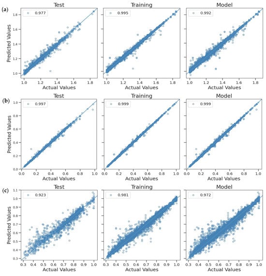 For the sake of brevity, detailed graphical results are presented exclusively for the models that have demonstrated excellent performance. Figure 7 illustrates the fit between the predicted and actual values for the CatBoost algorithm across the test, training, and model datasets. The model dataset refers to all examples, including both the test and training datasets.