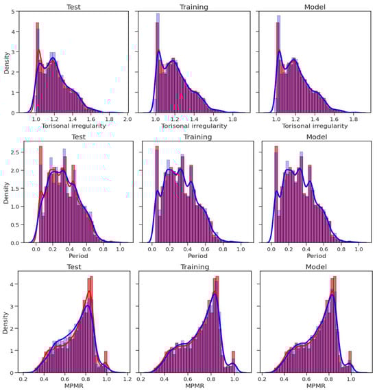 Figure 8 presents the density plots illustrating the CatBoost model outcomes for the three target variables across the testing, training, and overall model datasets. The plots use a red line to represent the actual results and a blue line for the predicted values. The x-axis shows the range of variable values, while the y-axis depicts the distribution density. Figure 8 also includes histogram plots that visually highlight the instances where the model either overestimates or underestimates the actual values. The histograms employ red to represent the distribution of the actual values and a transparent blue for the distribution of the predictions. The intersection of the two colors, which results in a purple bar, emphasizes the robust capture of regions where the contrast between actual and predicted values is concentrated. The evaluation revealed limited variance for torsional irregularity and period estimation within the test set, with these discrepancies amounting to no more than a very slight overestimation or underestimation. However, the residuals in MPMR estimation exhibited a slightly larger magnitude. In summary, the residuals remained confined to a narrow range within the dataset, which should not significantly impact the overall performance, especially considering the errors outlined in Table 2.