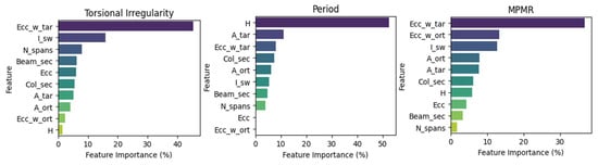 Feature importance analysis indicated that irregularly distributed infill walls significantly contribute to the creation of torsional irregularity. The feature Ecc_w_tar accounted for approximately 35% and 45% of the importance among other features for MPMR and torsional irregularity estimation, respectively. All features contributed to the estimation of the target parameters, each with a different portion.