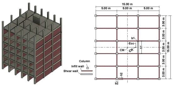 For architectural reasons, structures with masonry infill walls are widely adopted as a building method in numerous regions worldwide. This type of construction has been the subject of extensive research for approximately seven decades. Infill walls offer several advantages, including thermal and acoustic insulation, room division, and cost-effectiveness. However, they are susceptible to lateral forces due to their additional weight on structures. Additionally, masonry infill walls significantly contribute to a structure’s lateral stiffness and strength once they are uniformly arranged []. Therefore, it is crucial, where applicable, to align both the main structural elements and the infill walls regularly to minimize torsion development. However, achieving this ideal arrangement may not always be possible due to architectural requirements or other constraints.