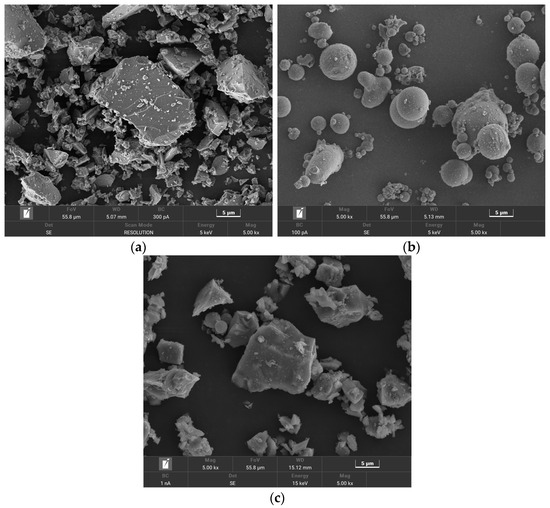 The chemical composition of the raw material powders was tested using the X-ray method, with the equipment being PANalytical Axios (Netherlands). The chemical composition is shown in Table 1. The microscopic morphology of the raw material powder is shown in Figure 1. The particle size distribution of the raw material powders was tested using a BT-9300S laser particle size analyzer (China), with D50 values of 6.21 μm and 11.36 μm, as shown in Figure 2. The density and specific surface area are shown in Table 2. The specific surface area and density of the raw material powders were tested according to GB/T 8074 [55] and GB/T 208 [56].