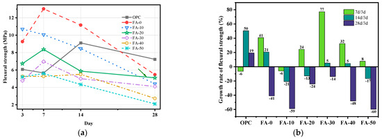 Figure 5. Flexural strength development of each mix: (a) 3–28 d; (b) the growth rate of compressive strength.