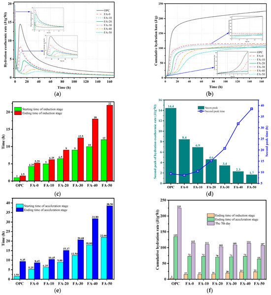 Regarding the hydration properties of alkali-activated cementitious materials, the addition of superabsorbent polymer reduced the drying shrinkage of AAGC mortar, improved compressive strength to some extent, and delayed the hydration heat release rate [36]. Nedunuri et al. [37] reported low cementitious activity of FA [8]. As the FA content increased, the setting time of AAGC increased, and the hydration heat release rate slowed down; the smaller the particle size of GBFS, the shorter the induction period of hydration of Na2CO3-activated FA-GBFS cement, promoting the formation of C-(N)-S-A-H and calcite [38]. The reaction rate of NaOH-activated FA cement primarily depends on the particle size distribution of FA, FA composition, and NaOH concentration [39].