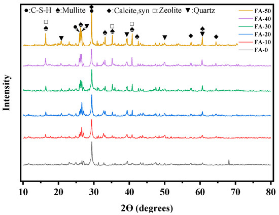 After curing to the test age, the neat paste specimens were broken into small pieces and soaked in anhydrous ethanol (≥48 h) to stop hydration. They were then dried in a vacuum oven at 40 °C (≥48 h), ground, sieved through an 80 μm sieve, and the powder samples were bagged and labeled for qualitative analysis of the mineral composition of hydration products at different test ages.