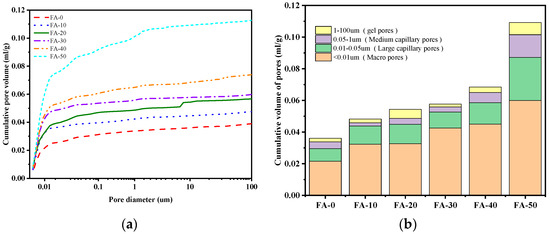Figure 9. MIP results of AAGC pastes at 28 days: (a) cumulative pore volume; (b) cumulative pore volume of AAGC at different scales.