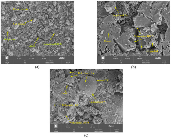Figure 10. SEM images of AAGC paste specimens with different FA contents: (a) FA-0; (b) FA-30; (c) FA-50.