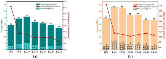 Figure 13. Strength and the cumulative hydration rate: (a) 3 d; (b) 7 d.