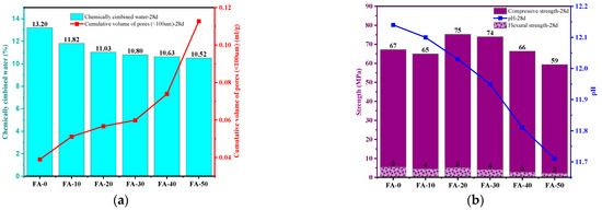 Figure 14. Correlation analysis: (a) chemically combined water and cumulative volume of pores at 28 days; (b) strength and pH values at 28 days.