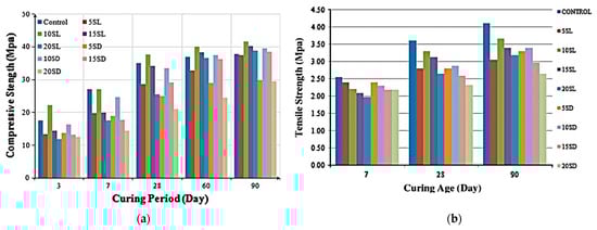 Mechanical performance of cement-based material mixed with steel slag. (a) Compressive strength and (b) splitting tensile strength [].