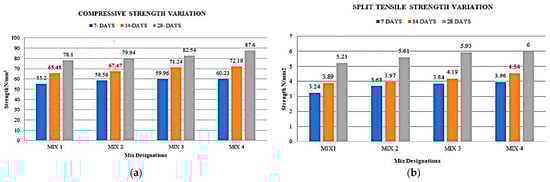 Roslan [] replaced cement with a 5%, 10%, 15%, and 20% proportion of steel slag separately. The results demonstrated that incorporating steel slag enhanced cement concrete’s compressive strength. The addition of 10% steel slag was the optimum dose. At the age of 3 days, the early compressive strength of the specimen was 27%, which was greater than the control sample. At 28 days, the specimen with 10% doping attained its maximum compressive strength of 42 MPa (Figure 4a). The splitting tensile strength results are shown in Figure 4b []. The results indicated that adding steel slag positively improved the flexural strength. This improvement can be attributed to the filling effect and pozzolanic activity of steel slag in the concrete mixture [,,,,].