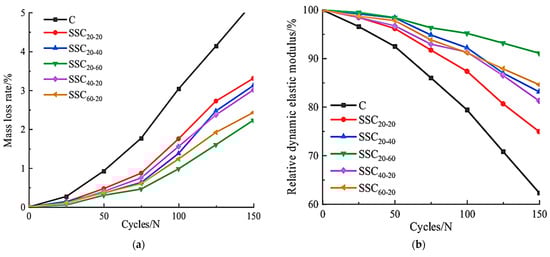 | 20%, 40%, 60% | 150 times, 50 times was a cycle of mass loss test, relative dynamic elastic modulus test | The weight loss rate ranged from 2.233 to 3.024%. The relative dynamic elastic modulus ranged from 74.92 to 91.09%. | Yang Wen [102] | |