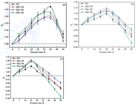 | Sulfate alternates between dry and wet | 30%, 60%, 90% | 56 days, 7 days was a cycle compressive strength test, mass change test, relative dynamic elastic modulus test | When Kc decreases with the increase in steel slag content, it could be divided into three stages, namely increasing, slow loss, and accelerating loss. The dynamic elastic modulus increased first and then decreases. | Cheng [103,104] |