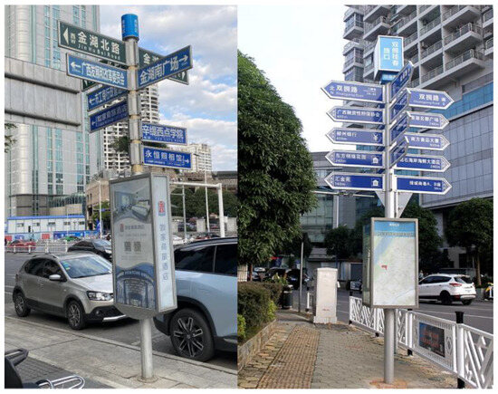 To ensure the research sample comprehensively covered the variety of pedestrian environments and wayfinding signage in Nanning, this study collected photos of wayfinding signs across seven different urban districts of Nanning. The photographs encompassed a range of walking environments, including complex intersections, busy and quiet streets, commercial walking areas, financial districts, and residential areas (Figure 3). A total of 362 photographs were taken, ensuring the sample broadly represents the diverse application of pedestrian wayfinding signage throughout the city. This extensive collection of samples enables this study to accurately reflect the visual preferences of Nanning’s pedestrians under various environmental conditions.