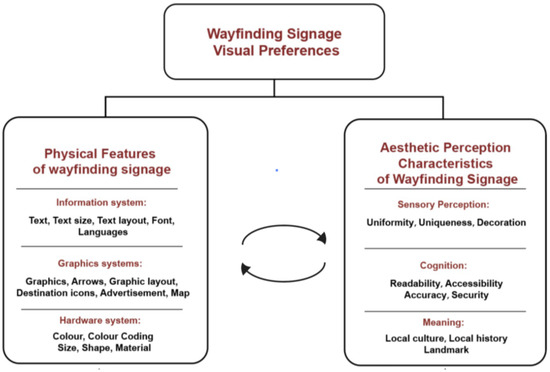 Evaluating visual preferences primarily comprises two methods: objective evaluation based on physical paradigms and subjective evaluation based on psychological paradigms [34,35]. The objective method regards the aesthetic quality of landscapes as an intrinsic attribute of the object, evaluating objects or landscapes through quantified design parameters [36]. This approach emphasizes measurable physical features, such as color, shape, and material. In contrast, the subjective evaluation method assumes that aesthetic quality is determined by the observer’s subjective experience, focusing on individual perceptions and emotional responses, such as decorativeness, readability, and safety [37,38,39]. However, many researchers in the field of aesthetic preference assessment contend that the evaluation is not merely a simple correspondence between object features and individual responses, it is a complex interactive process where the physical characteristics of the landscape and the psychological reactions of the observer interact, jointly influencing visual preferences [40,41]. Therefore, it is essential to systematically review the physical features and aesthetic-perceptual characteristics of wayfinding signage, observing their interactions to fully understand the mechanisms forming visual preferences in wayfinding signage.