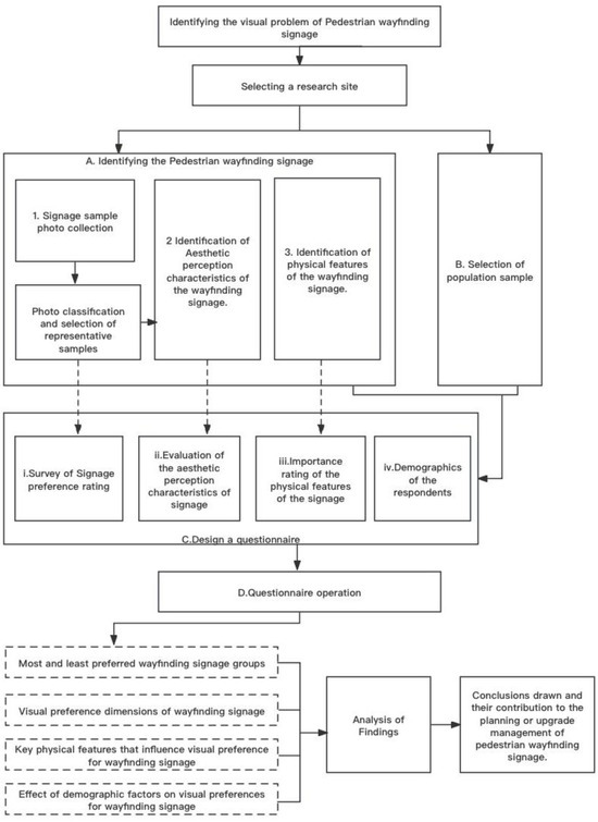 We first confirmed the effectiveness of visual preference as a method for evaluating the design of urban spaces, particularly in urban planning and environmental design. Through a review of relevant literature, we further understood that visual preference is driven by a complex mechanism involving the interplay of physical and psychological characteristics. The physical characteristics relate to the tangible design elements of wayfinding signage, such as text, graphics, and materials, which directly influence how pedestrians process information. The psychological characteristics emphasize the subjective perceptions and emotional responses pedestrians experience when interacting with signage, such as perceived uniformity, uniqueness, and the cultural or historical significance conveyed.