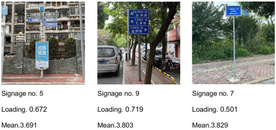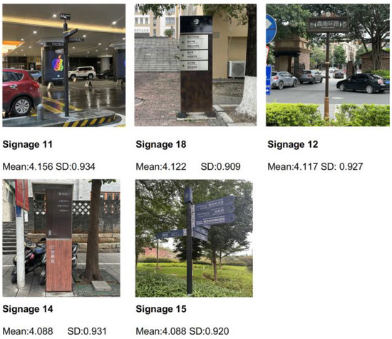 This study initially employed descriptive statistics to determine the average visual preference scores for 18 wayfinding signage samples. The descriptive analysis revealed that participants exhibited moderate preferences for Nanning’s wayfinding signage, with an overall average preference score of 3.960 (SD: 1.022), indicating a slight preference for these signs. Subsequently, the signage was ranked based on average preference scores, distinguishing the five most and least favored signage photos. This step aimed to identify the signs that performed best and worst in public preference. Figure 6 displays the most preferred group of signs, which scored an average preference of 4.114 (SD: 0.924), falling within the favorable range on a 5-point Likert scale.