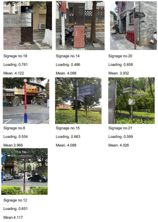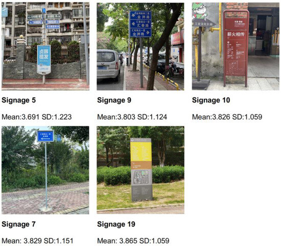 Figure 7 shows the least preferred group of signs, with an average preference score of 3.803 (SD: 1.131). Although this score is lower than that of the most preferred group, it remains within an acceptable range. The subsequent sections will provide a detailed analysis of the common features and differences between these two groups of signage.