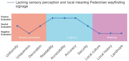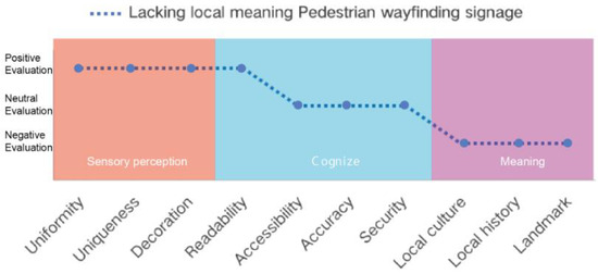 The meaning dimension explores the deep cultural values conveyed by the signage [59], specifically encompassing local history, local culture, and landmarks. Local history involves the historical background and cultural stories displayed on the signage; local culture reflects the local cultural characteristics embodied by the signage; landmark indicates distinctive local symbols marked on the signage, all of which enhance pedestrians’ cultural identification and sense of belonging with the signage.