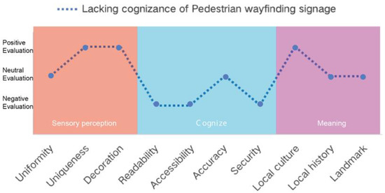 The cognitive dimension describes how pedestrians understand and interpret the information on the signage [59], with aesthetic-perceptual characteristics including readability, accessibility, accuracy, and security. Readability assesses whether the information on the signage is easy to read and understand; accessibility concerns whether pedestrians can easily access the information; accuracy refers to the correctness and precision of the information; security pertains to the perception of safety that pedestrians have while using the signage.
