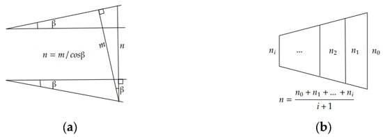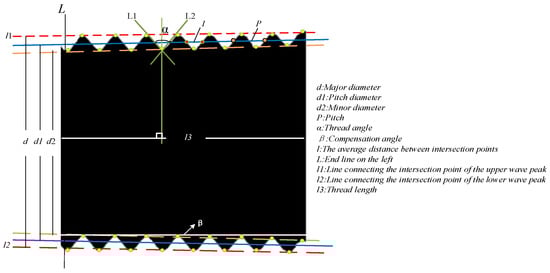 As the actual processed thread head typically appears in a tiny cone state, as depicted in Figure 5, it is not parallel to the upper and lower states. Therefore, compensation calculation is essential when determining the major, pitch, and minor diameters. Using the calculation of the minor diameter as an example, given that the fitted upper minor diameter line makes an angle of β with the horizontal line, and considering that the processed thread head is often symmetrical up and down, the theoretically fitted lower minor diameter line also makes an angle of β with the horizontal line. To calculate the appropriate length of the minor diameter, it is crucial to compensate for its length. This compensation allows obtaining the actual array of the minor diameter length of the rebar thread head. Figure 6 illustrates the specific compensation method. By setting a particular data in the minor diameter array as m, the actual minor diameter length is calculated as n = m / c o s β . The final average minor diameter length is then calculated as n = 0 i n i i + 1 . The same methodology applies to compute the major and pitch diameters.