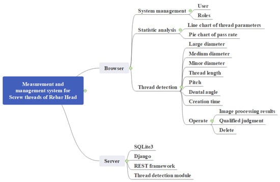 The inspection system for screw threads of rebar head, based on machine vision, consists mainly of hardware and software components. The system’s schematic diagram is shown in Figure 7. The hardware components of the system include a backlight, an industrial camera, a PLC controller, etc. The software system is the measurement and management system for screw threads of rebar head, featuring a Browser/Server (B/S) architecture [28]. The system’s composition is shown in Figure 8. The browser-side component is developed through the Layui framework, a lightweight front-end UI framework based on popular web development technologies (HTML, CSS, JavaScript). This framework provides a range of UI components and rigorous coding specifications, allowing for the quick construction of responsive web pages. It also provides a variety of built-in modules, such as forms, tables, pop-ups, and rotations, to meet various development needs. In addition, Layui provides a flexible extension mechanism, allowing customisation and expansion of components according to individual needs. The server-side component is developed through the Django framework, an open-source web application framework written in Python with its own ORM system. Django provides efficient development tools and features for building complex, flexible, and secure web applications. The Django REST framework is a set of tools and libraries for building and publishing Web APIs based on the RESTful architecture. The combination of Django and the Django REST framework enables fast creation of a comprehensive web application. Django manages the server-side logic and data processing, while the Django REST framework is used for creating and deploying the web API, which facilitates data interaction and communication between the front-end and back-end systems. The program adopts the SQLite database as its preferred choice for data storage. SQLite is a lightweight, cross-platform embedded relational database management system that operates as a library, which can be directly integrated with the application. It does not require a separate server process. Additionally, it is rated as a lightweight database engine that excels in terms of speed, reliability, simplicity, and cross-platform ability. The system can operate online within the production line. To minimize expenses, the inspection system integrates a MindVision CMOS Gigabit Ethernet industrial camera with 5-megapixel and a parallel backlight. Additionally, a PLC-controlled conveyor chain transmits the rebar head to the camera lens for image acquisition, which is uploaded to a computer. The captured images are then processed using Python and OpenCV to calculate the dimensional parameters of the thread head. Based on the national standard, it is determined whether the screw threads of rebar head are qualified or not. Finally, the results of the inspection are displayed on the web front-end.