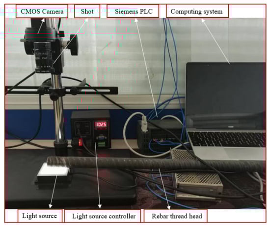 Non-contact measurement techniques mainly include laser inspection, eddy current inspection, ultrasonic inspection, and the microscopic measurement method, among others [5]. An automatic thread parameter measurement system was introduced by Tong et al. [6], which was based on the laser measurement theory. The system employed a position sensitive device (PSD) to measure the coordinate data of the thread profile and uses a precision grating to detect and estimate the thread profile’s axial displacement. An inspection system was designed by Yang et al. [7] to evaluate defects in workpieces by monitoring impedance changes in the inspection coil of an eddy current sensor. They used the principle of eddy current flaw inspection to identify defects in the thread root of the drilling rod. Li et al. [8] established an experimental platform for laser ultrasonic inspection. They employed the thermoelastic effect and laser interferometric reception method to observe the directionality of the transverse wave generated by a point-focused excitation and the effects of defects on the ultrasonic signals at the inner surface. This enabled the location of cracks on the inner surface of round pipe-type thread components. This study succeeded in localizing cracks on the inner surface of a circular pipe thread component. Companies such as KORDT in Germany [9] and Universe in the United States have developed thread detectors that can measure various thread parameters, eliminating errors caused by visual fatigue or subjectivity, and accurate data is efficiently recorded as a result. Of the non-contact measurement methods mentioned above, laser inspection can measure the thread diameter; however, laser inspection is more sensitive to environmental factors, and its application is limited. Eddy current and ultrasonic inspection, on the other hand, qualify the threads, but cannot determine the specific size of the rebar thread head. Eddy current inspection is applicable to small batches, while ultrasonic inspection is mainly reserved for large-scale equipment in coal-fired power plants and other non-destructive inspections. Although industrial microscopes and other optical principles can meet the accuracy requirements for thread measurement, improving the inspection speed is difficult. While various detectors can measure a variety of parameters, their high cost can pose challenges for enterprise production and operation.
