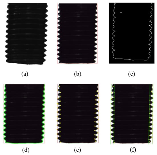 Figure 10. (a) Image preprocessing; (b) ROI extraction; (c) Edge extraction; (d) Image contours; (e) Corner detection; (f) Robust line fitting.