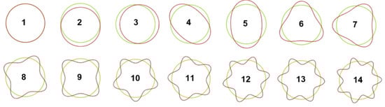 Buckling analysis through GBT involves (i) a cross-sectional analysis to obtain the deformation modes and equivalent mechanical properties, as detailed in [34,35,36]. The most relevant deformation modes in this work include the shell-type mode, introduced by Schardt [36] (see Figure 2), and the axisymmetric mode, first presented by Silvestre [34] (see Figure 3), and (ii) beam analysis, which involves solving the eigenvalue problem to determine critical loads and buckling modes, followed by a detailed interpretation of the results. The critical buckling pressure is associated with the smallest eigenvalue, i.e., the pressure at which the first buckling mode occurs.