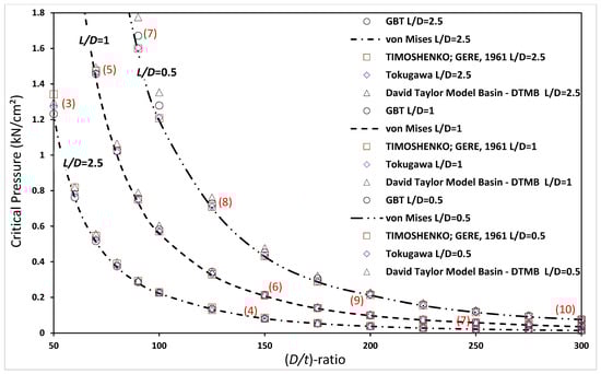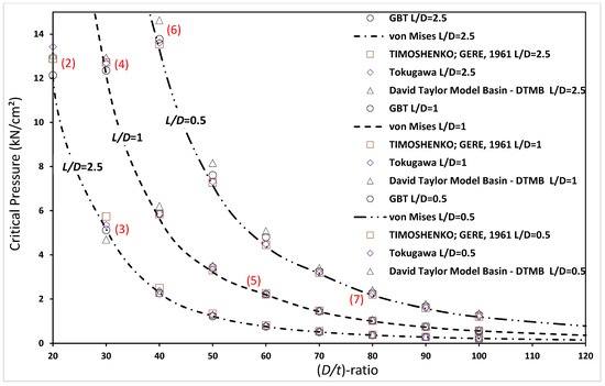 Table 1 presents the critical buckling pressures obtained from (i) Equation (1)—von Mises; (ii) GBT analyses; and (iii) Ansys SFEA, for D/t = 100 and L/D = 0.5.