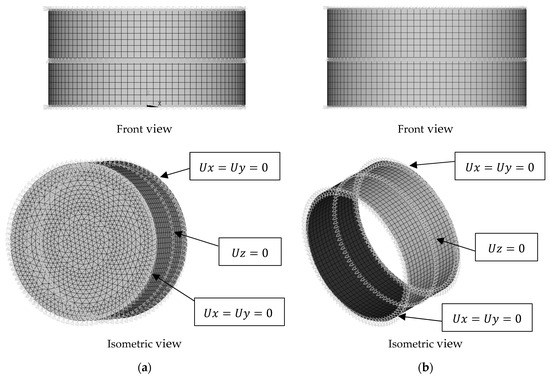 General view of the SFE with D/t = 100 and L/D = 0.5: (a) Ansys End Closed—EC; (b) Ansys End Open—EO.