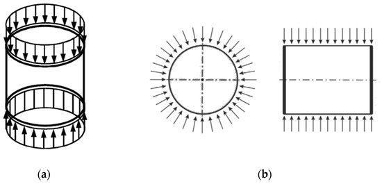In the context of hydrostatic pressure, EN 1993-1-6 [1] treats it as an interaction between circumferential buckling (from pressure on the wall) and meridional buckling (from pressure on the end cross-section walls) [20]. Taking that into account, it is usual to consider both stresses as being independent of each other. The design values of actions for the meridional stress are derived from (), while those for the circumferential (hoop) stress are determined using (). For simple load hydrostatic external pressure, the () ratio is 2 [37,44]. The terms are denoted as the cylindrical radius, , thickness, , and external pressure .