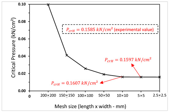 The development of the FE model occurred using the Ansys computational software package [24]. It employs a quadrilateral SFE SHELL181, which includes six degrees of freedom per node to model the CHS members. The mesh size of 10 mm × 10 mm (length by width) was selected based on a mesh sensitivity analysis, as shown in Figure 10. Various mesh sizes, including 200 × 200 mm, 100 × 100 mm, 50 × 50 mm, 10 × 10 mm, 5 × 5 mm, and 2.5 × 2.5 mm, were evaluated. The chosen mesh size provided an optimal balance between computational accuracy and efficiency, in line with the recommendations in [43,46,47,48]. In this study, specimen 40, as presented by [23], was used with a length , diameter , thickness , modulus of elasticity , and Poisson’s ratio . To validate the study, the value indicated by the dashed lines in the graph corresponds to the hydrostatic pressure determined by the authors.