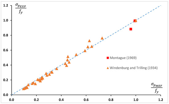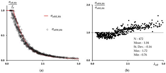 Figure 16a displays the strength curve (blue line), while Figure 16b plots the values against . The statistical evidence in Table 3 clearly illustrates the substantial improvement in the accuracy of failure stress predictions. The results presented validate the proposed design methodology’s effectiveness in predicting the collapse stress of circular shells. Furthermore, the number of unsafe failure load predictions decreases considerably.