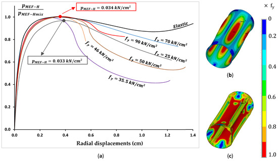 The methodology for applying cylindrical shell strength Equations (14) and (15) is structured as follows: (i) determining the elastic local critical pressure; (ii) the stress associated with local buckling () for axisymmetric mode loading and supported is determined, based on the von Mises criterion using GBT analysis; (iii) nondimensional slenderness is then determined (); (iv) the three possible types of strength reduction curves are assessed (χ); and finally, (v) obtaining the characteristic buckling stresses () by multiplying the characteristic yield strength () with the reduction factors χ.