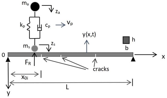 The pedestrian–cracked bridge coupling system is shown in Figure 1. The model of the bridge with cracks is depicted as a simply supported beam following Euler–Bernoulli’s theory, spanning a length of L and featuring a rectangular cross-section with dimensions of width b and height h. The pedestrian is modeled using a linear oscillator model [,], in which the pedestrian’s body mass is divided into two parts: the sprung mass and the unsprung mass . The parameters and represent the spring constant and the damping coefficient of the pedestrian’s equivalent mechanical system, respectively. For analytical convenience, it is assumed that the dynamic load, designated as , is exclusively a result of the pedestrian’s vertical displacement. This implies that horizontal and longitudinal movements of the body do not contribute to the vertical force exerted on the ground. The pedestrian moves at a consistent speed, , which is constant from one step to the next.