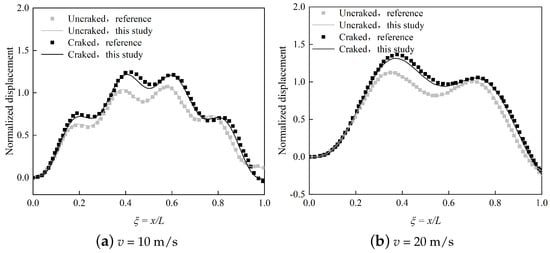 Next, we utilized the parameters for a simply supported cracked beam and moving mass provided in reference [] and applied Equations (5)–(7) and (9) to calculate the displacement response of the cracked beam. By comparing these results with those from reference [], we verified the correctness of the coupled Equation (1). The bridge parameters used in Equations (5)–(7) and (9) were as follows: length m, width m, height m, Young’s modulus N/m2, and mass per unit length kg/m. In addition, the moving mass was of the total beam mass. In reference [], based on a torsional spring model, the dynamical response of the cracked beam was derived using an iterative modal analysis method, considering six vibration modes and dividing the beam into 100 segments. It was discovered that the outcomes were identical to those achieved by incorporating nine vibration modes with the beam segmented into 400 parts.