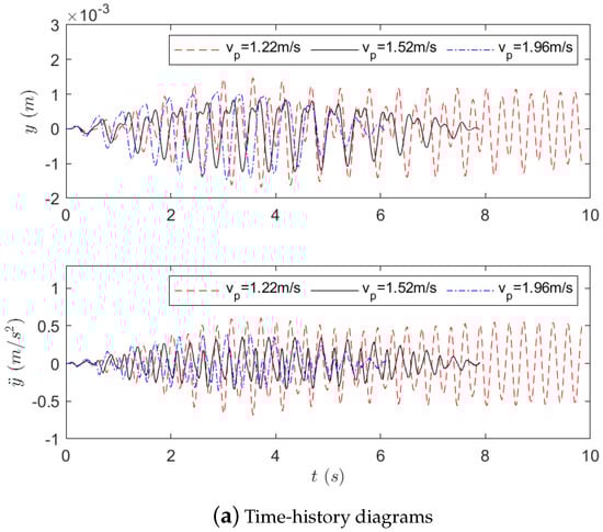 Suppose the bridge has five cracks positioned at the one-sixth, one-third, one-half, two-third, and five-sixth points of the span. Figure 10 and Figure 11 illustrate the impact of the cracks on the mid-span displacement and acceleration time-history curves and spectra of the bridge at different pedestrian speeds for two cases with crack depth ratios of 0.05 and 0.1, respectively.