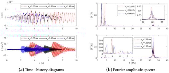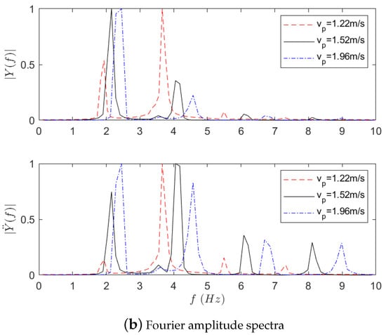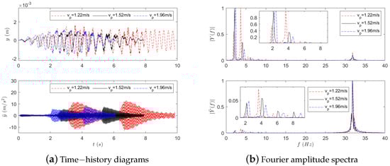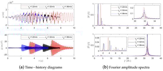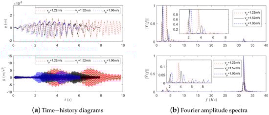 Figure 3 illustrates the time-varying displacement and acceleration profiles at the bridge’s mid-span in the absence of cracks, along with their respective Fourier amplitude spectra at various walking velocities. The findings indicated a slight reduction in both displacement and acceleration at the mid-span of the uncracked beam with an increase in the pedestrian’s walking speed.