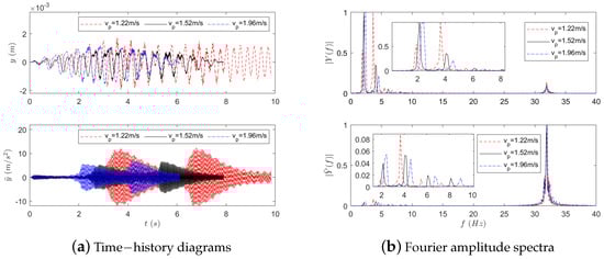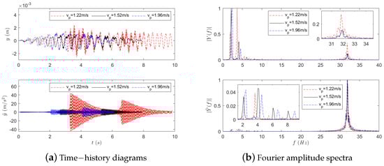The mid−span displacement and acceleration responses of the intact bridge at various pedestrian speeds. (a) The time−history curves; (b) The Fourier amplitude spectra.