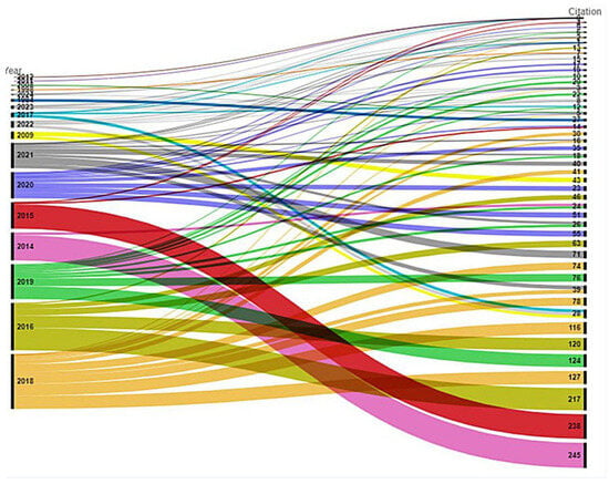 Alluvial diagram illustrating the connections between the publication year and citation count.