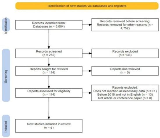Following the initial search, we applied exclusion criteria to refine the selection of studies. We focused on studies published after 2016, written in English, and categorized as either articles or conference papers, ensuring they contained all necessary data for thorough analysis. This approach was intended to ensure that only relevant and recent studies were included for evaluation. As a result, six studies met these criteria and were included in our review, as illustrated in Figure 4. To provide a comprehensive overview, we sought to gather essential data from these studies, including the dosage of crystalline admixtures (CA %), the compressive strength of both the control and treated samples (MPa), the duration of evaluation (days), the water-to-cement ratio (w/c), the treatment conditions, the permeability control and treatment, the concrete type, and the type of crystalline admixture used. Additionally, we ensured access to the full texts of these studies and selected experiments to avoid redundancy while maintaining a focused and concise presentation in our article.
