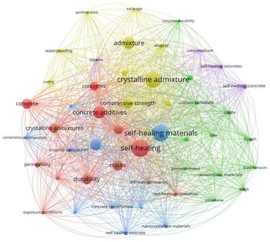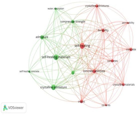 When exploring the impact of crystalline additives on concrete, researchers commonly investigate their influence on several key properties: self-healing, compressive strength, permeability, and corrosion resistance. A bibliometric analysis of 114 articles revealed that self-healing and corrosion resistance were frequently discussed, with keywords related to self-healing appearing 51 times and durability 30 times. Compressive strength was mentioned 29 times, while permeability appeared 15 times. Figure 7 shows the connections between keywords with a minimum occurrence of 15 times on VOSviewer.