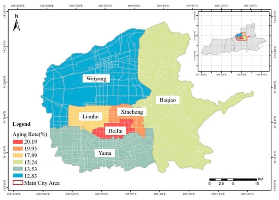 The questionnaires for this study were distributed across six central administrative districts in Xi’an City (Figure 2). According to the seventh population census data of Xi’an, the number of elderly people aged over 60 in the central urban area exceeds the international standard of 10%, with the aging rate in the three most central districts exceeding 20% []. Xi’an, once a pilot city for China’s elderly care policies, has seen over a decade of development in community elderly care service facilities since their establishment in 2009. Until 2021, Xi’an had established 32 comprehensive elderly care service centers and 926 community elderly care service stations, achieving a facility coverage rate of 83% []. In relevant surveys among the elderly in Xi’an, a third of them expressed their hope that the community could provide elderly care services. However, there are still limitations in facility service capabilities, failing to meet the needs of the elderly []. Therefore, conducting research in the main urban areas of Xi’an can provide a good understanding of the current usage status of elderly care service facilities and the actual needs of the elderly, making it highly representative.