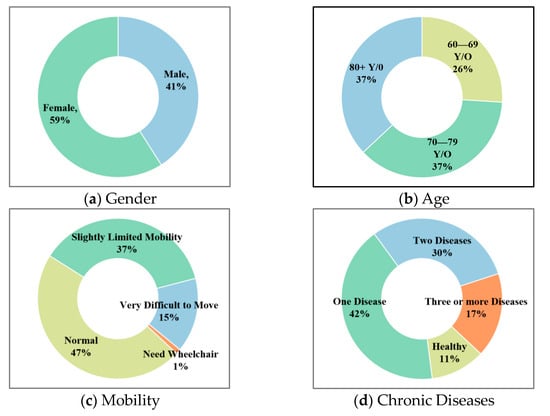 A total of 215 valid questionnaires were collected for the survey, and the basic details of the survey data are shown in Figure 3. Among them, the age distribution is relatively even, with a lower proportion of younger elderly aged 60–69 years old, accounting for only 26%. This may be due to the fact that younger elderly people’s travel activities are not limited to the community, resulting in fewer samples being collected. The proportions of middle-aged elderly people aged 70–79 years old and very elderly individuals aged over 80 years old are both 37%.