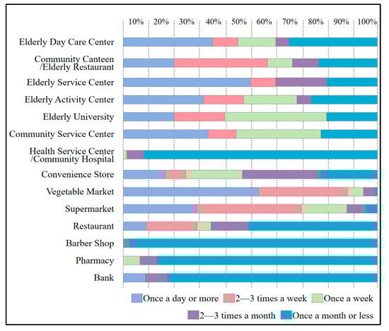 As shown in Figure 4, there is a significant difference in the frequency of use for all types of facilities. The vegetable market is the most frequently used facility, with nearly half of the elderly having the habit of visiting the market once a day or more, and one-third indicating that they visit 2–3 times a week. Elderly service centers are also facilities that are frequently used by the elderly. For health service centers/community hospitals, pharmacies, barbershops, and banks, the overall usage frequency of the sample is relatively low, with over 80% of users indicating that they use these facilities once a month or less. In addition, the number of users of convenience stores and restaurants is also relatively low, with more than half of the participants visiting these facilities at most once a month.
