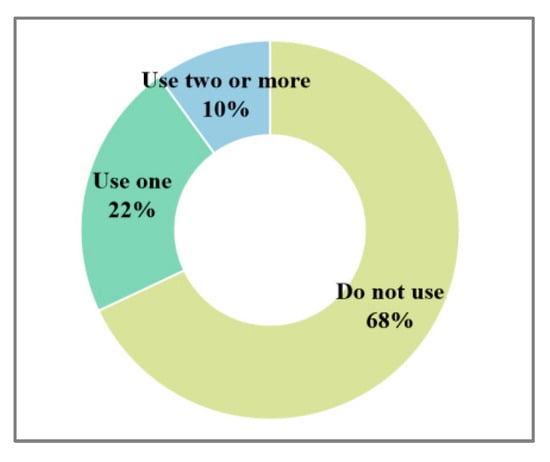 As shown in Figure 5, for those facilities specialized in serving the elderly (including day care facilities for the elderly, elderly service facilities, elderly activity facilities, elderly university, and elderly restaurants), the total number of users of these facilities is relatively small. A total of 67.6% of elderly people in the survey do not use or report that there are no such facilities surrounding their communities, 22.3% of elderly people use one type of elderly service facility, and only 9.8% of elderly people use two or more types of elderly service facility.