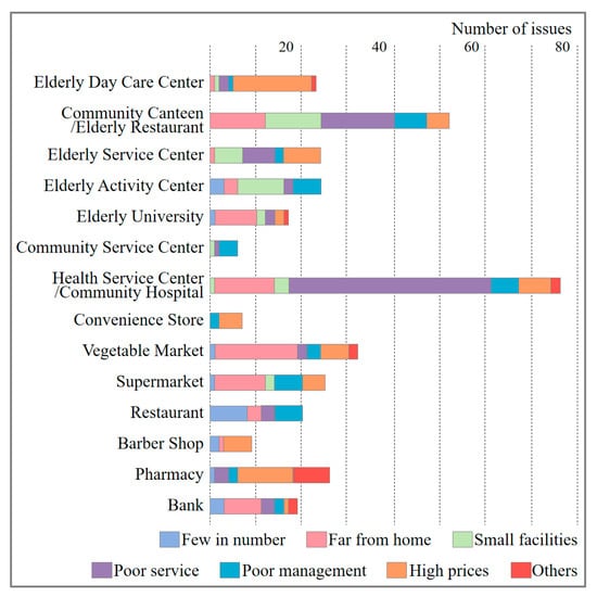 The health service center/community hospital has the most prominent issues, mainly characterized by low service levels, a lack of doctors and medicines, and the inability to meet basic medical needs. The problems with community canteens/elderly restaurants are also very prominent, mainly due to low service levels, small facility rooms, and facilities being far from home. The main issues with elderly day care centers are high prices; the elderly believe that their meager pensions, after paying for daily medicines, are insufficient to afford the high cost of day care services. The main problem with elderly service centers and elderly activity centers is that their area is too small. The main problem with the elderly university is that it is far from the community.