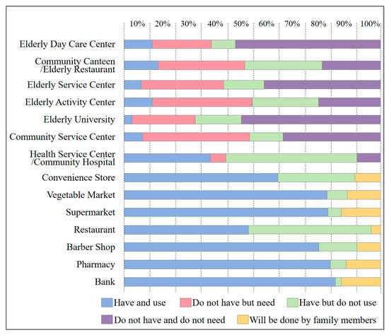 For commercial service facilities, the elderly believe that every type of facility exists in the existing neighborhood, with about 80% of the elderly expressing their willingness to use the vegetable market, supermarket, hairdressing services, pharmacies/medicine stores, and banks. The demand for convenience stores is relatively low (59.9%), and the demand for dining is the lowest (48.5%), which is the facility that the elderly say they have around their residence but use the least. In addition, there is a minority of about 10% in each type of facility where the elderly themselves do not use the facility, instead having their family members fulfil the facility’s functions for them.